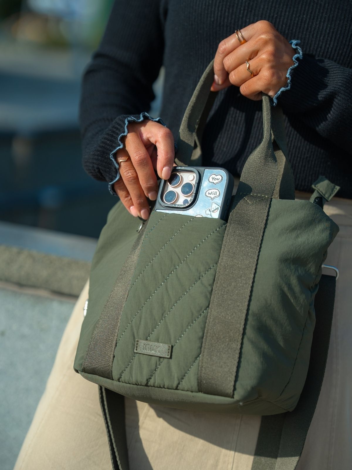 Modern and minimal — a soft quilted pattern, one zippered compartment for secure storage, and a quick access pocket on the front for things you need in a hurry.